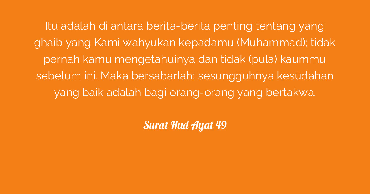 Tidak pernah engkau mengetahuinya dan tidak (pula) kaummu sebelum ini. " il discorso più veritiero è la parola di allah, e. Quran surat hud ayat 49 تِلْكَ مِنْ أَنۢبَآءِ ٱلْغَيْبِ نُوحِيهَآ إِلَيْكَ ۖ مَا كُنتَ تَعْلَمُهَآ أَنتَ وَلَا قَوْمُكَ مِن قَبْلِ هَٰذَا ۖ فَٱصْبِرْ ۖ إِنَّ ٱلْعَٰقِبَةَ لِلْمُتَّقِينَ 1 this is a book whose verses are perfected and then presented in detail from one who is wise and aware 2. ˹tell them, o prophet,˺ "worship none but allah.